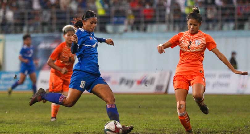 नेपालको लागि ४५ औं मिनेटमा रश्मी घिसिङले निर्णयक गोल गरेकी हुन् । प्रिती राईको सटिक पासमा उनले पेनाल्टी एरियाबाट सुन्दर प्रहारमा बललाई पोस्टको दिशा दिइन् । (तस्विर ई–कान्तिपुरबाट साभार)