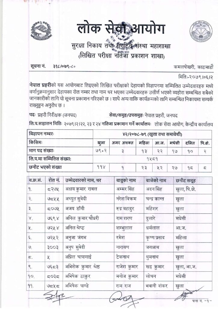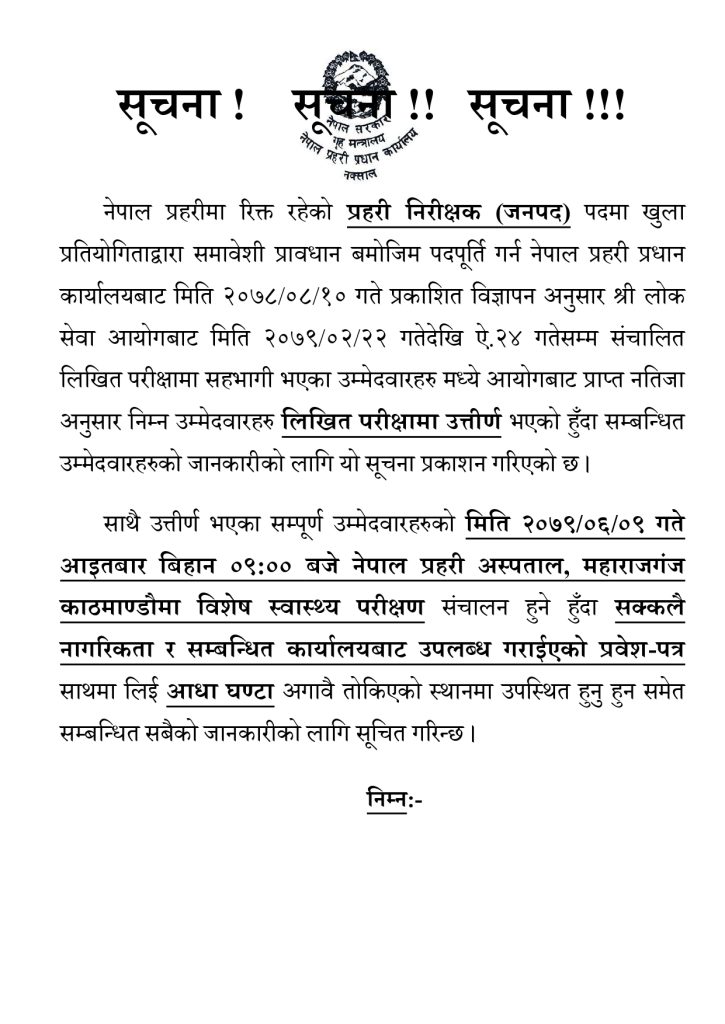 उत्तीर्ण उम्मेदवारहरूलाई असोज ९ गते प्रहरी अस्पताल महाराजगन्जमा विशेष स्वास्थ्य परीक्षणका लागि उपस्थित हुन प्रहरी प्रधान कार्यालयले सूचित गरेको छ ।