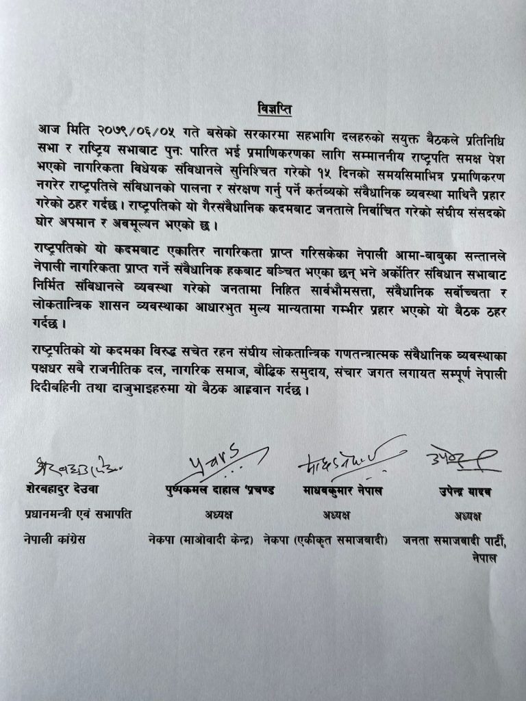 प्रतिनिधि सभा र राष्ट्रिय सभाबाट पुनः पारित भई प्रमाणीकरणका लागि राष्ट्रपतिसमक्ष पेश भएको नागरिकता विधेयक संविधानले सुनिश्चित गरेको १५ दिनको समयसीमाभित्र प्रमाणीकरण नगरेर राष्ट्रपति संविधानको पालना र संरक्षण गर्नुपर्ने कर्तव्यको संवैधानिक व्यवस्थामाथिनै प्रहार गरेको चार दलका शीर्ष नेताहरूले जनाएका छन् ।