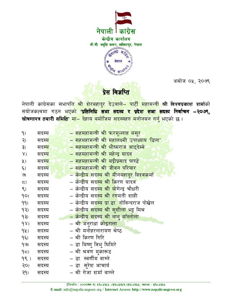 काठमाडौं । प्रधानमन्त्री समेत रहेका नेपाली कांग्रेसका सभापति शेरबहादुर देउवाले ‘प्रतिनिधि सभा सदस्य र प्रदेश सभा सदस्य निर्वाचन–२०७९, घोषणापत्र तयारी समिति’मा सदस्यहरू मनोनीत गरेका छन् ।