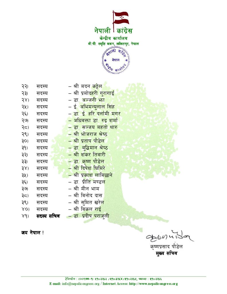 समितिको सदस्यमा सह–महामन्त्रीहरू फरमूल्लाह मंसुर, महालक्ष्मी उपाध्याय ‘डिना’, भीष्मराज आङ्देम्बे, महेन्द्र यादव, बद्रीप्रसाद पाण्डे, जीवन परियार रहेका छन् ।
