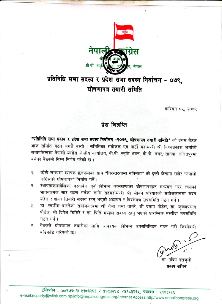 कांग्रेसले महामन्त्री विश्वप्रकाश शर्माको संयोजकत्वमा घोषणापत्र तयारी समिति बनाएको छ । यसअघि कांग्रेसले महामन्त्री गगन थापालाई स्थानीय तहको निर्वाचनको घोषणा पत्र बनाउने जिम्मेवारी दिएको थियो ।