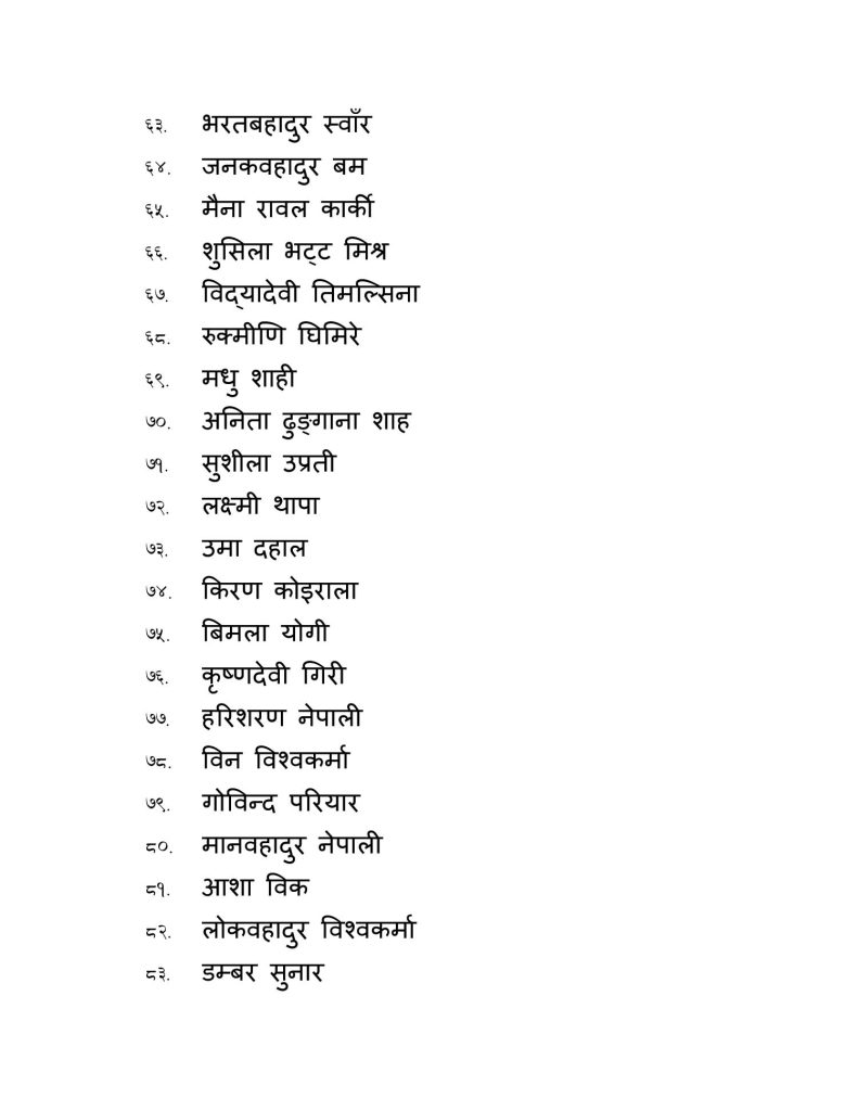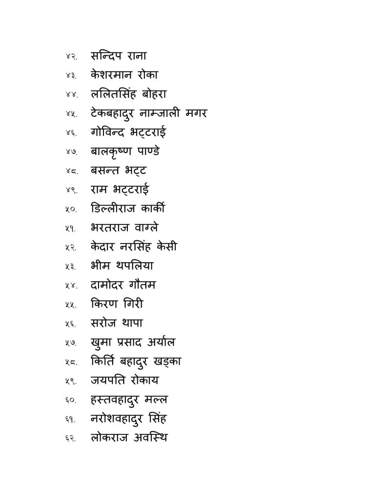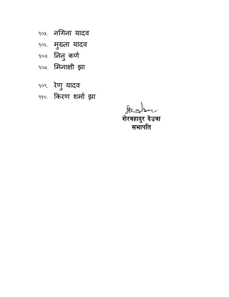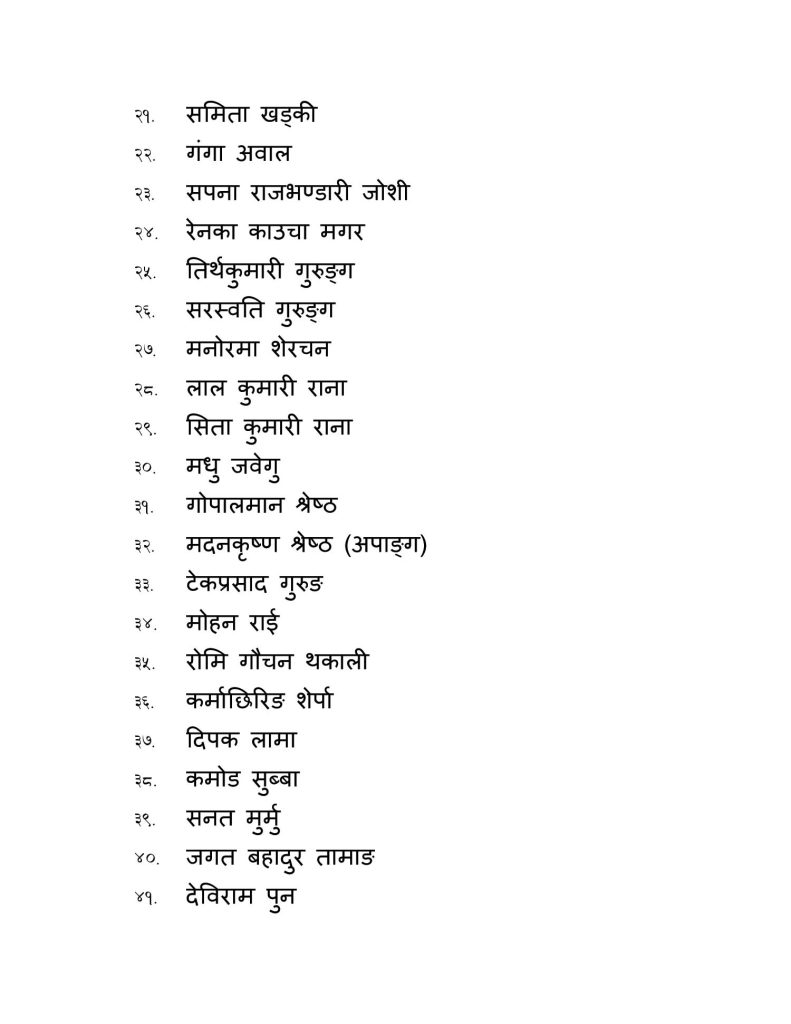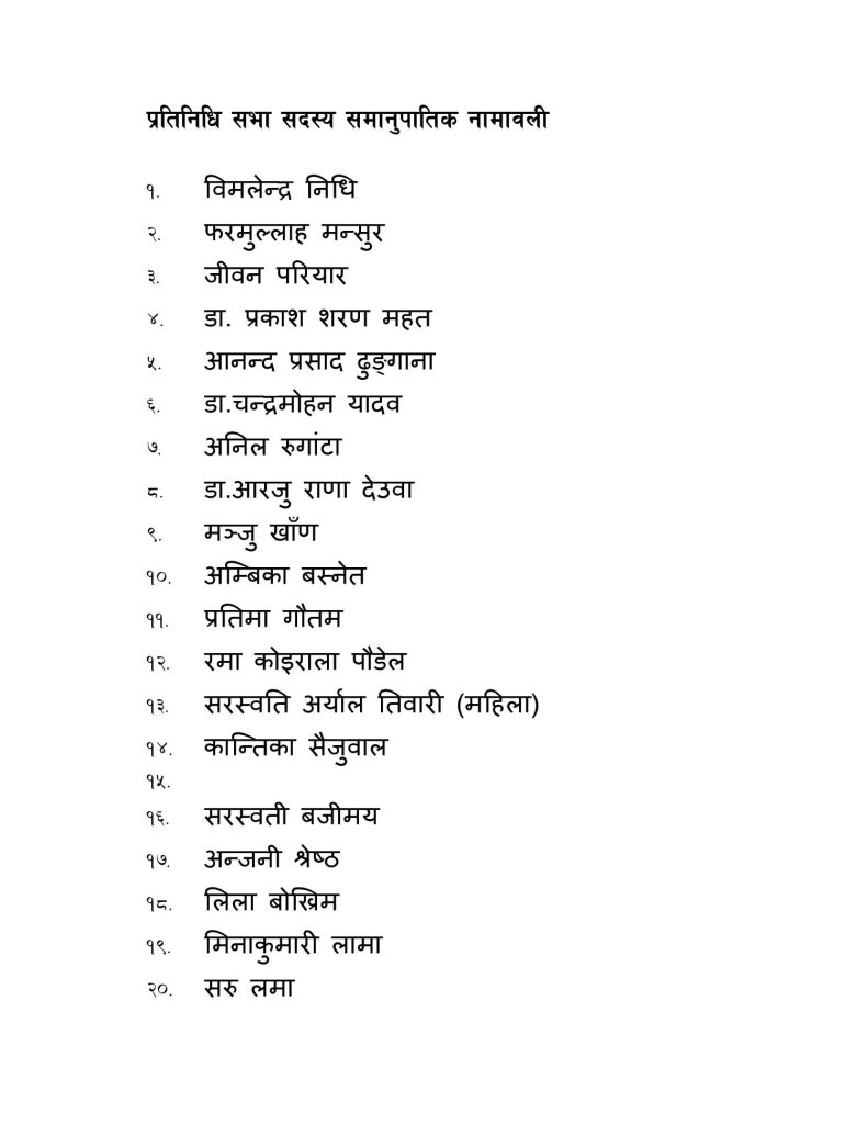 सूचीको पहिलो नम्बरमा नेता विमलेन्द्र निधि छन् । महिलाको पहिलो सूचीमा आरजु राणा छिन् । महिलाको दोस्रो नम्बरमा नेतृ मञ्जु खाण छिन् ।