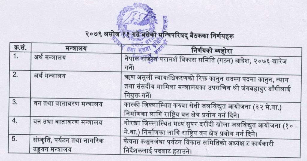 कास्की जिल्लास्थित करुवा सेती जलविद्युत आयोजना (३२ मेगावाट) निर्माणका लागि राष्ट्रिय वन क्षेत्र प्रयोग गर्न दिने निर्णय पनि सरकारले गरेको छ ।