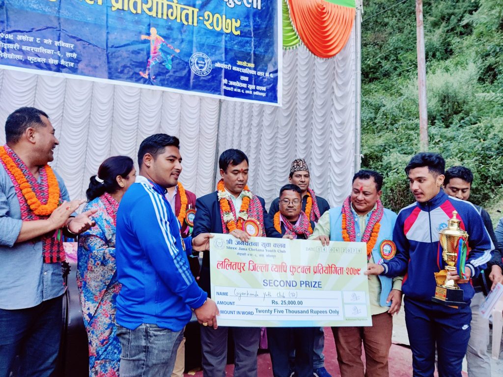 जनचेतना युवा क्लवद्वारा आयोजित ललितपुर जिल्लाव्यापी फुटबल प्रतियोगिता विजयी खेलाडी तथा प्रतियोगिता संचालनका लागि योगदान पुर्याउनेहरूलाई सम्मान तथा टोकन अफ लभ प्रमुख अतिथि गोदावरी नगरपालिकाका मेयर गजेन्द्र महर्जन, विशेष अतिथिहरू नेपाली कांग्रेसका प्रभावशाली युवा नेता तथा राष्ट्रिय खेलकुद परिषदका पूर्व कोषाध्यक्ष मीनकृष्ण महर्जन, उप–मेयर मुना अधिकारी, गोदावरी नगरपालिकाका प्रवक्ता तथा वडाध्यक्ष मिलन सिलवाल, वडाध्यक्ष विष्णुमान महर्जन, ललितपुर जिल्ला खेलकुद विकास समितिका अध्यक्ष विनोद महर्जनको उपस्थिति थियो । उनीहरूले पुरस्कार वितरण गरेका थिए ।
