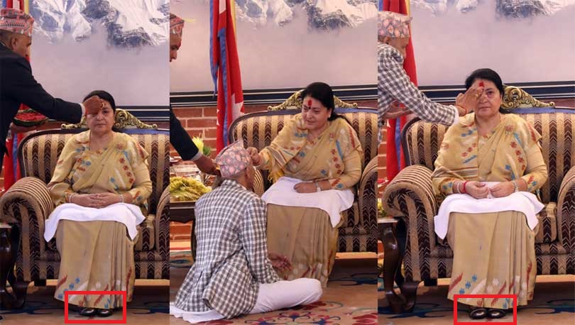 बुधबार राष्ट्रपति कार्यालय शीतल निवासमा भण्डारीले टीका लगाउने क्रममा जुत्ता नखोलेको तस्बिरमा देखिएको छ । भण्डारीलाई गुरूहरू देवराज अर्याल र खेमचन्द्र ढकालले टीका लगाइदिएका थिए ।