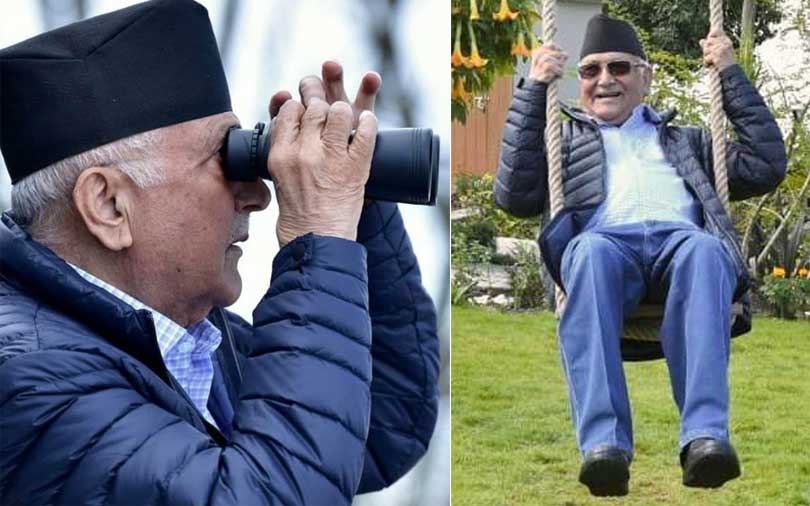 पिङ खेल्दै गरेको, दुरबिनबाट काठमाडौंलाई हेर्दै गरेको लगायतका तस्बिर ओलीको फेसबुक पेजमा रहेका छन् ।