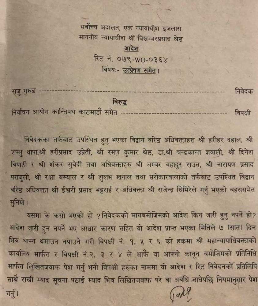 रिट निवेदकको माग बमोजिम अन्तरिम आदेश जारी गर्नु नपर्ने कुनै कारण भए ७ दिनभित्र लिखित जवाफ पेश गर्न पनि निर्वाचन आयोग लगायतका विपक्षीहरूलाई अदालतले आदेश दिएको छ ।