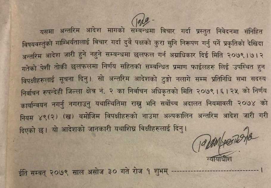 आइतबार न्यायाधीश विश्वम्भरप्रसाद श्रेष्ठको एकल इजलासले गुरुङको उम्मेदवारी कायम राख्न आदेश दिएको हो । अन्तरिम आदेशबारे छलफल गर्न सर्वोच्च अदालतले कात्तिक २ गते पेसी तोकेको छ ।