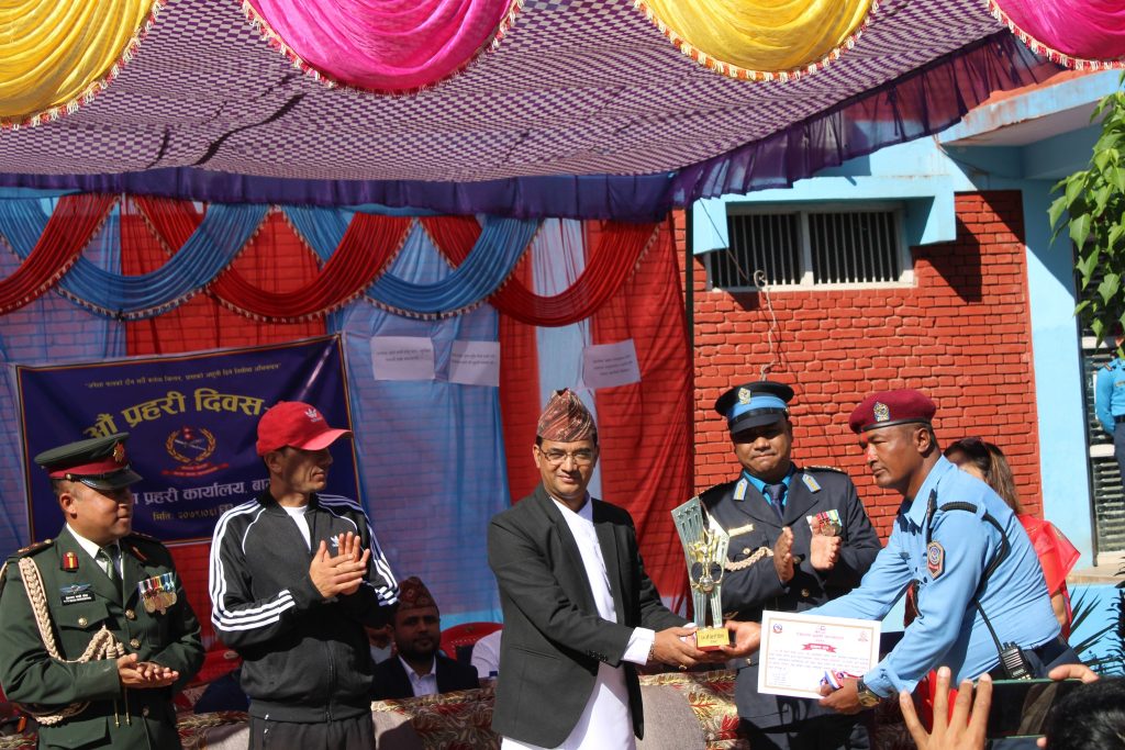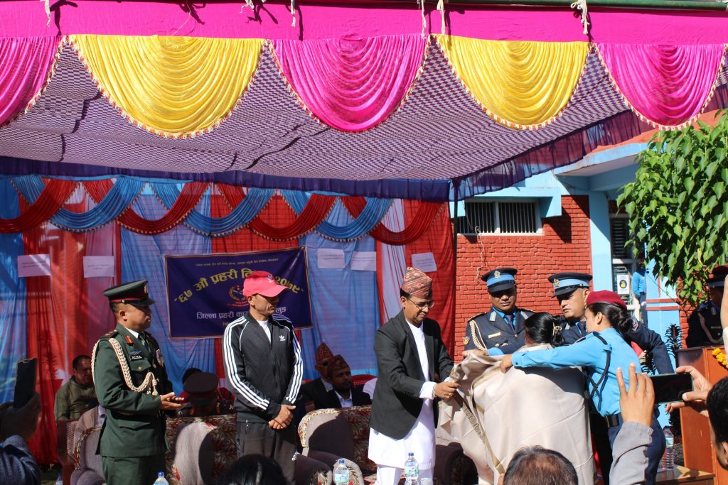 प्रहरी दिवशको उपलक्ष्यमा विविध खेलकुद कार्यक्रममा बिजेता खेलाडिहरूलाई पुरस्कृत गर्नुका साथै कार्यक्रममा प्रहरी नायब उपरीक्षक गंगाबहादुर थापाबाट प्रमुख अतिथि तथा कार्यक्रममा सहभागी सम्पूर्ण अतिथिहरूलाई स्वागत गरिएको थियो ।