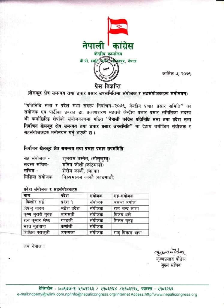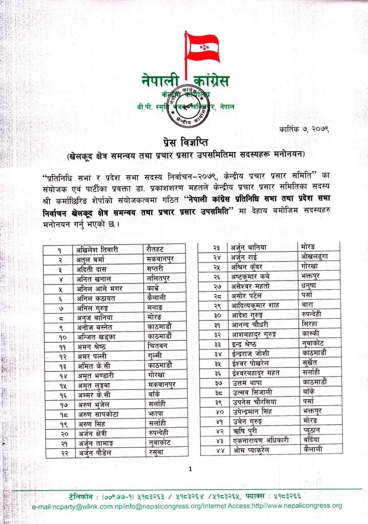 काठमाडौं । नेपाली कांग्रेस प्रतिनिधि सभा र प्रदेश सभा सदस्य निर्वाचन-२०७९, केन्द्रीय प्रचार प्रसार समितिअन्तर्गतको ‘नेपाली कांग्रेस प्रतिनिधि सभा तथा प्रदेश सभा निर्वाचन खेलकूद क्षेत्र समन्वय तथा प्रचार प्रसार उपसमिति’मा सदस्यहरु मनोनयन गरिएको छ ।