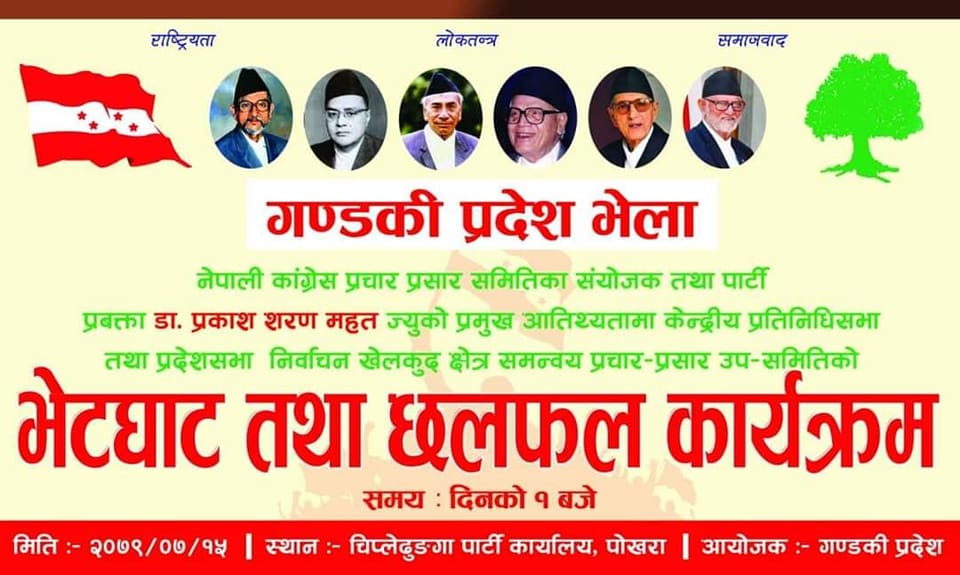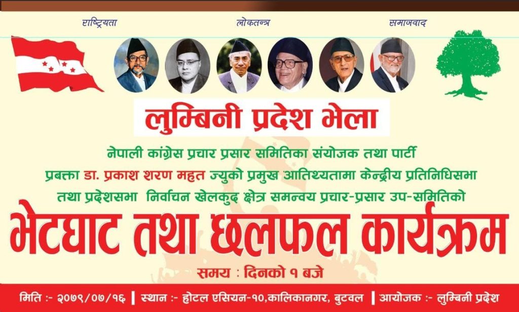 कार्यक्रममा कांग्रेसका प्रवक्ता एवम् प्रचार प्रसार समितिका संयोजक डा.प्रकाशशरण महतको प्रमुख आतिथ्यता र उपसमितिका संयोजक कर्माछिरिङ शेर्पाको विशेष आतिथ्यतामा भेटघाट तथा छलफल हुनेछ ।