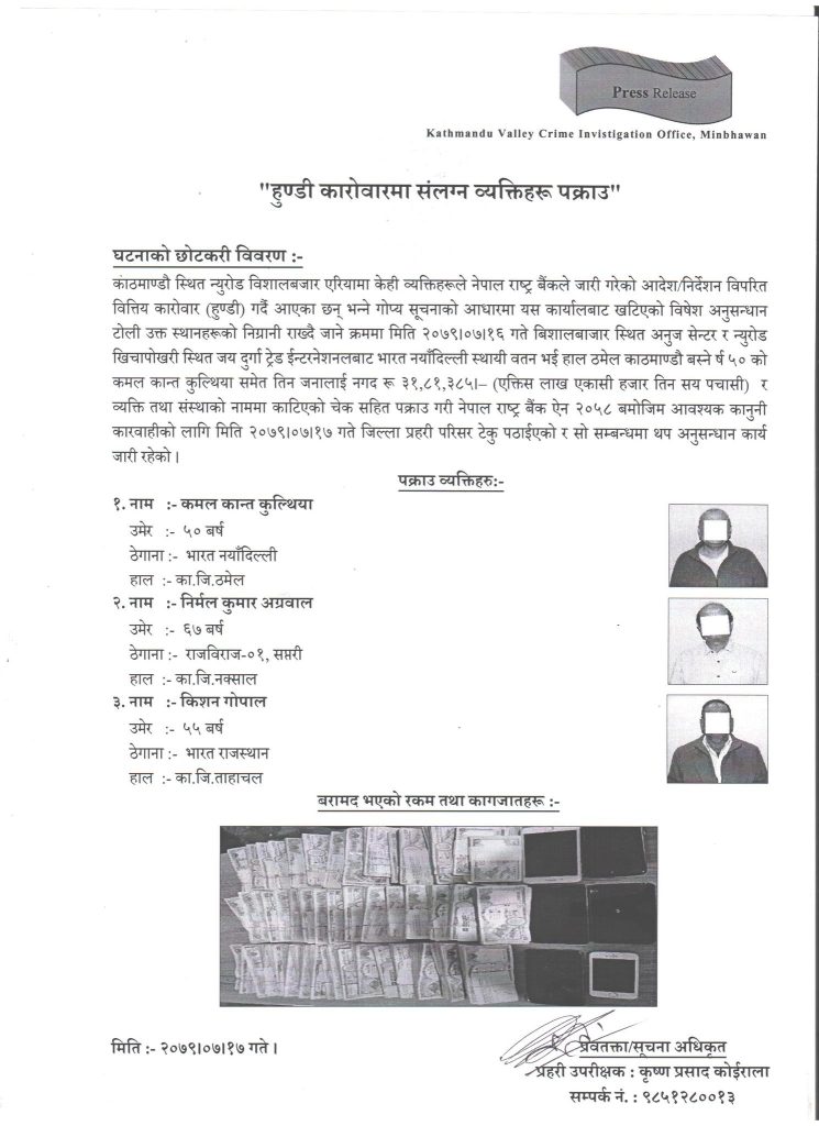 उनीहरूले नेपाल राष्ट्र बैंकले जारी गरेको आदेश/निर्देशन विपरीत वित्तिय कारोवार (हुण्डी) गर्दै आएका छन् भन्ने सूचनाको आधारमा काठमाडौं उपत्यका अपराध अनुसन्धान कार्यालय मीनभवनबाट खटिएको प्रहरीले नगद ३१ लाख ८१ हजार ३ सय ८५ रूपियाँ र व्यक्ति तथा संस्थाको नाममा काटिएको बैंक चेक सहित फेला पारी उनीहरूलाई पक्राउ गरेको हो ।