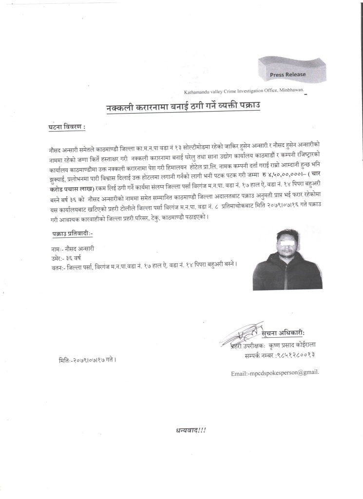 अन्सारी समेतले काठमाडौं महानगरपालिका–१३ सोल्टीमोडमा रहेको जाकिर हुसेन अन्सारी र नौसद हुसेन अन्सारीको नाममा रहेको जग्गा कीर्ते हस्ताक्षर गरी नक्कली करारनामा बनाई घरेलु तथा साना उद्योग कार्यालय काठमाडौं र कम्पनी रजिष्ट्रारको कार्यालय काठमाडौंमा उक्त नक्कली करारनामा पेश गरी ठगी गरेको खुलेको छ ।