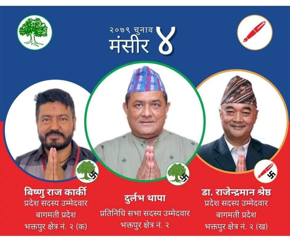 भक्तपुर–२ मा प्रतिनिधि सभातर्फ कांग्रेसबाट दुर्लभ थापा, प्रदेश सभातर्फ १ मा कांग्रेसका विष्णुराज कार्की र २ मा नेकपा (एकीकृत समाजवादी)का नेता डा.राजेन्द्रमान श्रेष्ठले उम्मेदवारी दिएका छन् ।