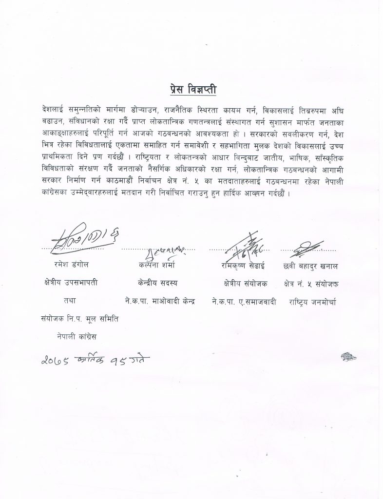 विज्ञप्ति जारी गर्नेमा कांग्रेसका क्षेत्रीय उप–सभापति एवम् निर्वाचन परिचालन मूल समितिका संयोजक रमेश डंगोल, माओवादी केन्द्रकी केन्द्रीय सदस्य कल्पना शर्मा, नेकपा (एकीकृत समाजवादी)का क्षेत्रीय संयोजक रामकृष्ण सेढाइँ र राष्ट्रिय जनमोर्चा काठमाडौं क्षेत्र नं. ५ का संयोजक छविबहादुर खनाल रहेका छन् ।