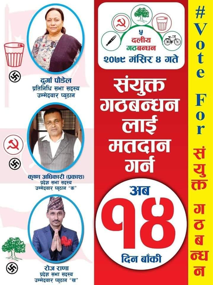 प्रतिनिधि सभातर्फकी उम्मेदवार एवम् राष्ट्रिय जनमोर्चाकी नेतृ दुर्गा पौडेलले संविधान र लोकतन्त्रको रक्षाका लागि सत्तागठबन्धनलाई विजयी बनाउनुपर्ने बताइन् । उनले प्यूठानको विकासमा अब राष्ट्रिय जनमोर्चा, माओवादी, कांग्रेसले नेतृत्व लिएर काम गर्ने बताइन् ।