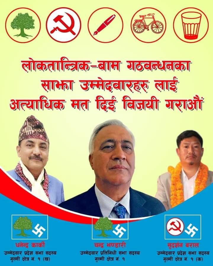 प्रदेश सभातर्फ १ मा माओवादी केन्द्रका नेता सुदर्शन बरालको उम्मेदवारी छ । प्रदेश सभातर्फ २ मा कांग्रेसका नेता धनेन्द्र कार्कीले उम्मेदवारी दिएका छन् ।