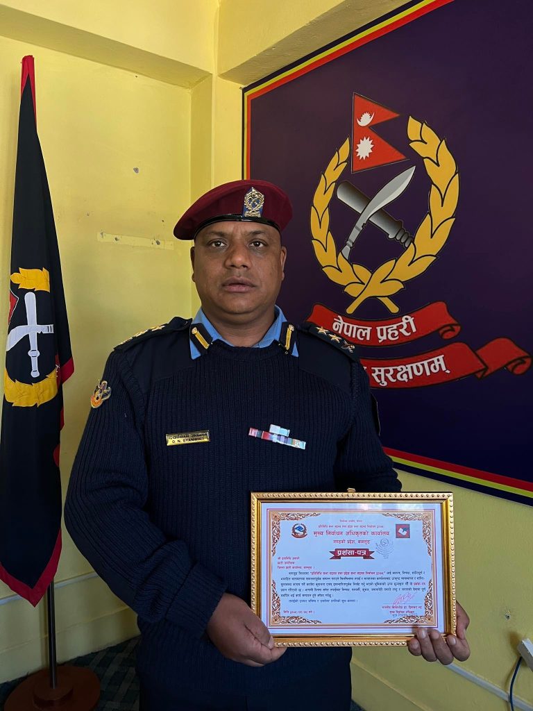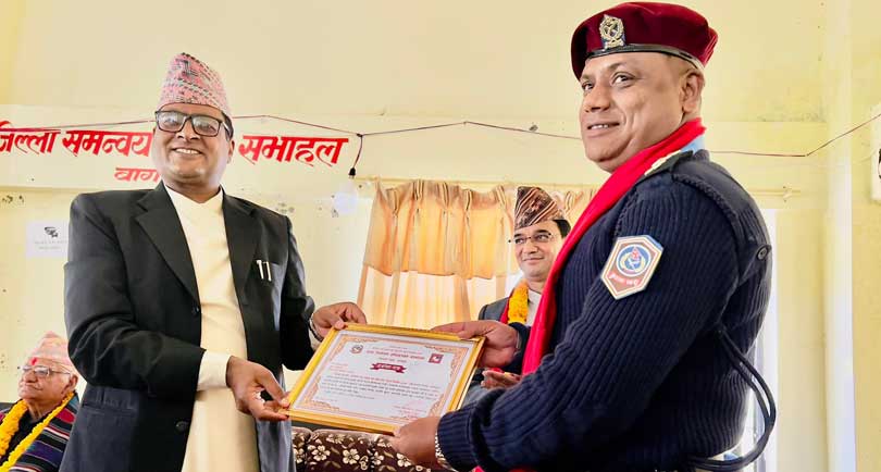 बागलुङ जिल्लामा ‘प्रतिनिधि सभा तथा प्रदेश सभा सदस्य निर्वाचन २०७९’ लाई स्वतन्त्र, निष्पक्ष, शान्तिपूर्ण र भयरहित वातावरणमा सफलतापूर्वक सम्पन्न गराउन, उत्कृष्ठ व्यवस्थापन र शान्ति तथा सुव्यवस्था कायम गर्ने कार्यमा कुशलता एवं ईमान्दारितापूर्वक जिम्मेवारी निर्वाह गरेको भन्दै मुख्य निर्वाचन अधिकृत डा.भट्टले प्रशंसा पत्र प्रदान गरेका हुन् ।