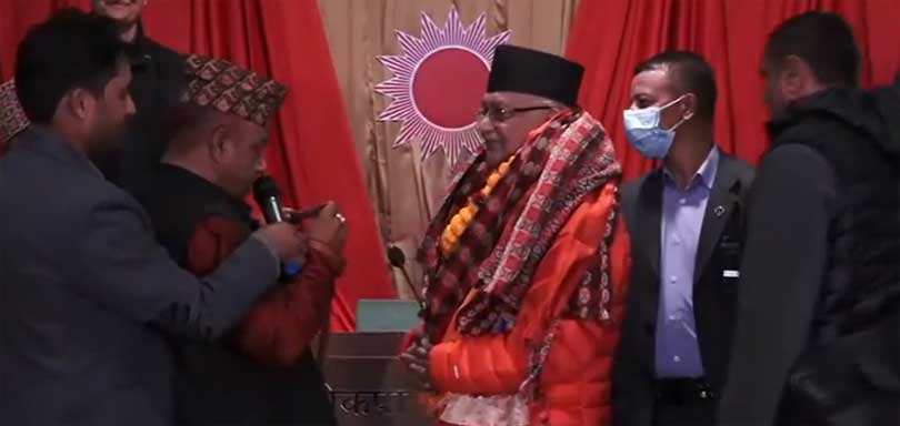 पण्डित वृहङगमराज तिमल्सिनाले एमालेका अध्यक्ष ओलीको स्वस्ति शान्तिका लागि मन्त्रोच्चारण गरेका गरेका छन् ।