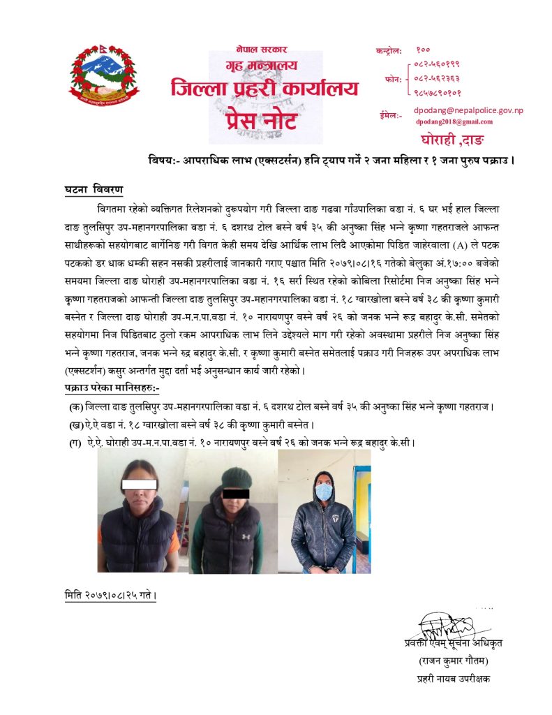 प्रहरीले आपराधिक लाभ (एक्सटर्सन) हनीट्याप गर्ने २ महिला र १ पुरुषलाई मंसिर १६ गते साँझ ५ बजे घोराहीको सर्रास्थित कोबिला रिसोर्टबाट तीन जनालाई पक्राउ गरेको विज्ञप्तिमा उल्लेख छ ।