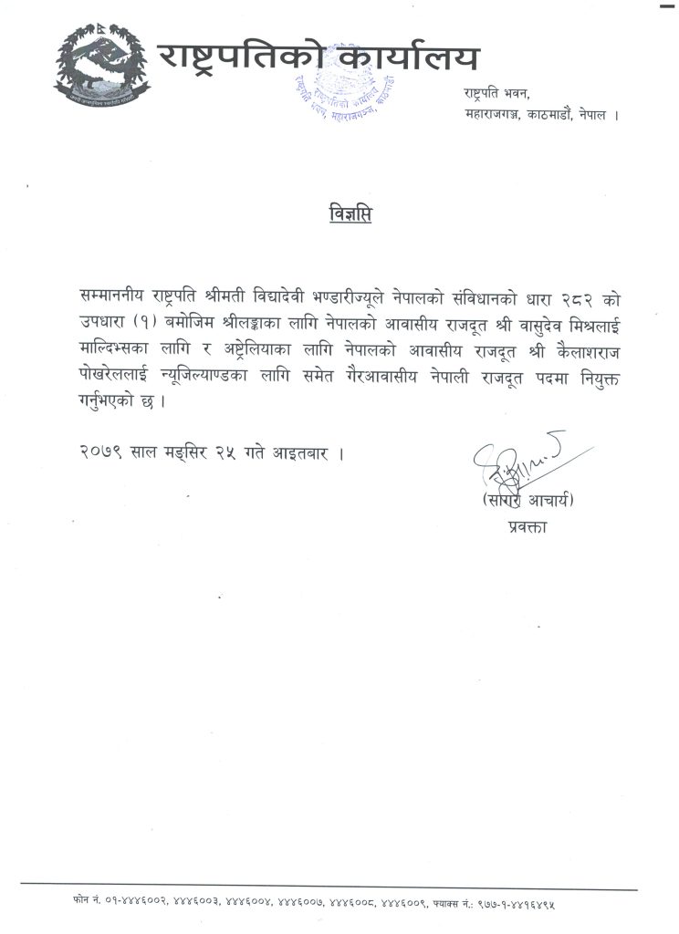 सरकारको सिफारिसमा राष्ट्रपतिले आइतबार श्रीलंकाका नेपाली राजदूत वासुदेव मिश्रलाई माल्दिभ्सको लागि गैरआवासीय राजदूत पदमा नियुक्त गरेकी छिन् ।