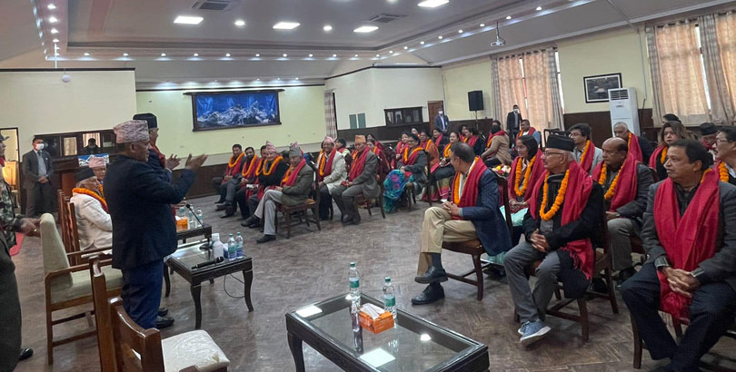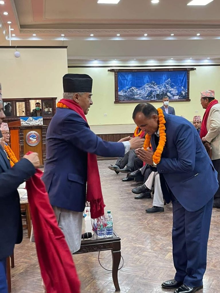सभापति देउवाले नवनिर्वाचित सांसदहरूलाई खादा लगाइदिएर बधाइ तथा शुभकामना दिएका थिए ।