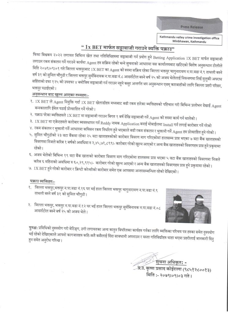 फिफा बिश्वकप २०२२ लगायत विभिन्न खेल तथा गतिविधिहरूमा सट्टाबाजी गर्ने प्रयोग हुने बेटिङ एपमार्फत सट्टेबाजी लगाउन रकम संकलन गर्ने गराउने कार्यमा एजेन्टहरू सक्रिय रहेको भन्ने सूचना पाएपछि प्रहरी परिचालित भएको थियो ।