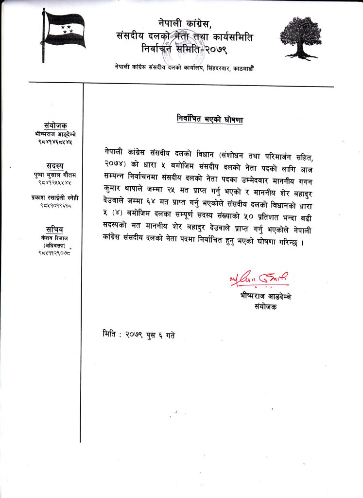 संसदीय दलको नेता पदका लागि सभापति शेरबहादुर देउवा र महामन्त्री गगनकुमार थापा प्रतिस्पर्धामा छन् ।
