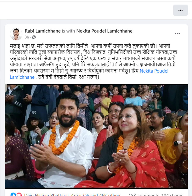 लामिछानेले शनिबार बिहान सामाजिक सञ्जालमा पत्नीको फोटो राखेर प्रशंसा गरेका हुन् । निकिताको शनिबार जन्मदिन परेको छ । सोही जन्मदिनको अवसरमा लामिछानेले विभिन्न बुट्टा भरेर लेखेका हुन् ।