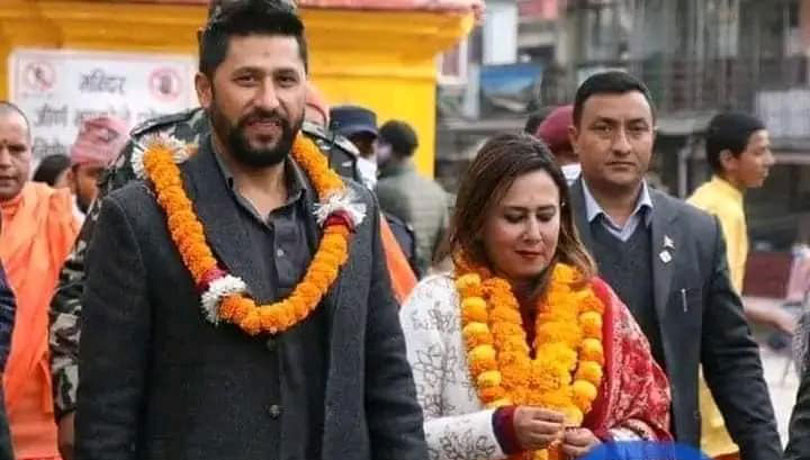 लामिछाने उप–प्रधान एवम् गृहमन्त्री बनेपछि पत्नीसँग मन्दिरमा दर्शन गरेर फर्किन लागेका बेला निकिताले झोला हातमा बोकेकी छिन् । अगाडि पछाडि सुरक्षाकर्मीहरू छन् । गृहमन्त्री लामिछाने र निकिताले फूल माला लगाएका छन् ।