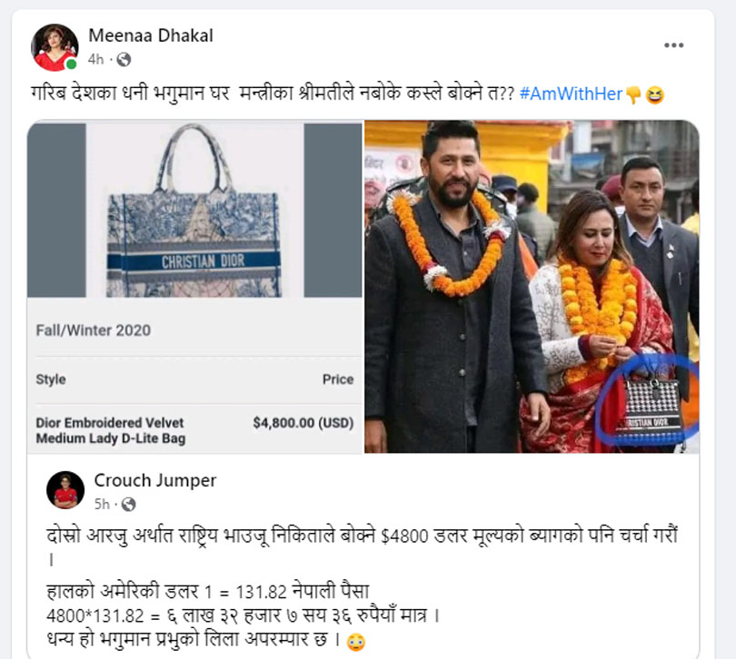 गृहमन्त्री लामिछाने र उनकी पत्नी निकिताको तस्बिर र झोलाको मूल्यलाई गोलो घेरा लगाएर ‘क्रोच जम्पर’ नामको फेसबुकमा राखिएको छ । सोही स्टाटसलाई ढकालले पनि सेयर गरेकी छिन् ।