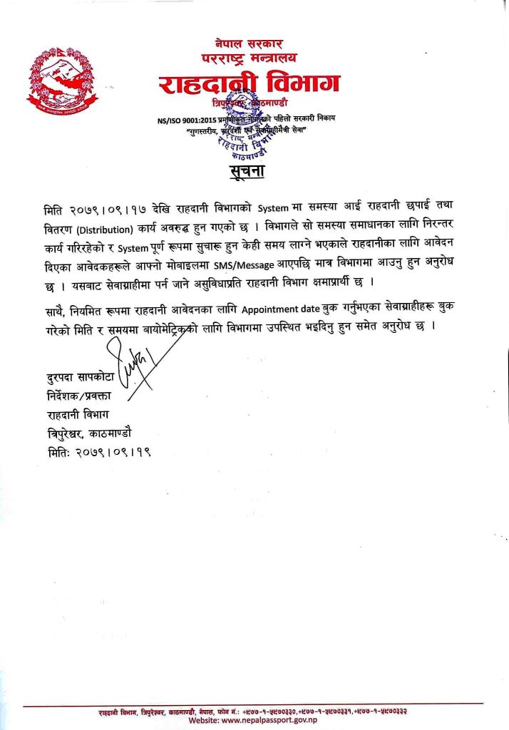 विभागले अर्को सूचना जारी नहुँदासम्म राहदानी लिन नआउन सेवाग्राहीलाई आग्रह गरेको छ ।