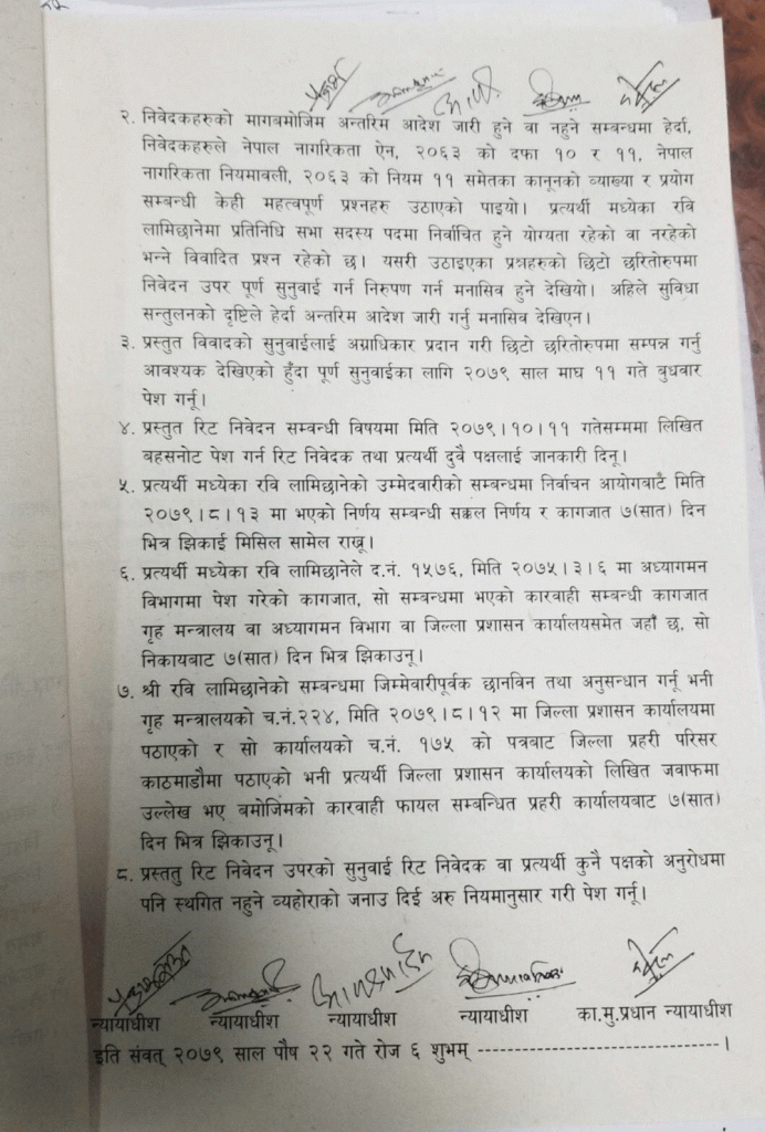 कामु प्रधानन्यायाधीश हरिकृष्ण कार्की र न्यायाधीशहरू ईश्वरप्रसाद खतिवडा, आनन्दमोहन भट्टराई, अनिलकुमार सिन्हा र प्रकाशमानसिंह राउत सम्मलित संवैधानिक इजलासले अन्तरिम आदेश जारी नगर्ने निर्णय सुनाएको छ । सर्वोच्चको आदेशले लामिछानेलाई तत्कालका लागि राहत मिलेको छ ।