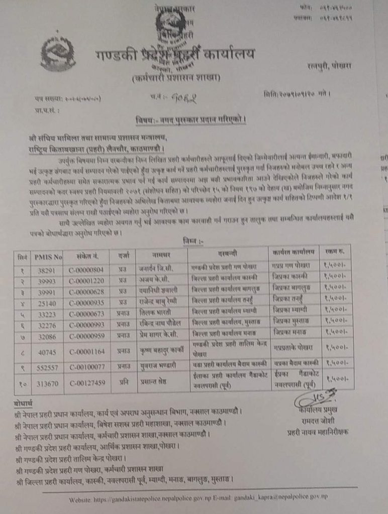 ‘प्रदेश प्रहरी कार्यालयले उनीहरूलाई पुरस्कृत गर्दा मनोबल उच्च रहने र अन्य प्रहरी कर्मचारीहरूमा समेत सकारात्मक प्रभाव पर्न गइ कार्यसम्पादनमा अझै बढी प्रभावकारिता आउने देखिएकोले कार्यसम्पादनको कदरस्वरुप प्रहरी नियमावली २०७१ (संशोधन सहित) को परिच्छेद १५ को नियम १९७ को देहाय (ख) बमोजिम पुरस्कृत गरिएको छ’, पत्रमा भनिएको छ ।