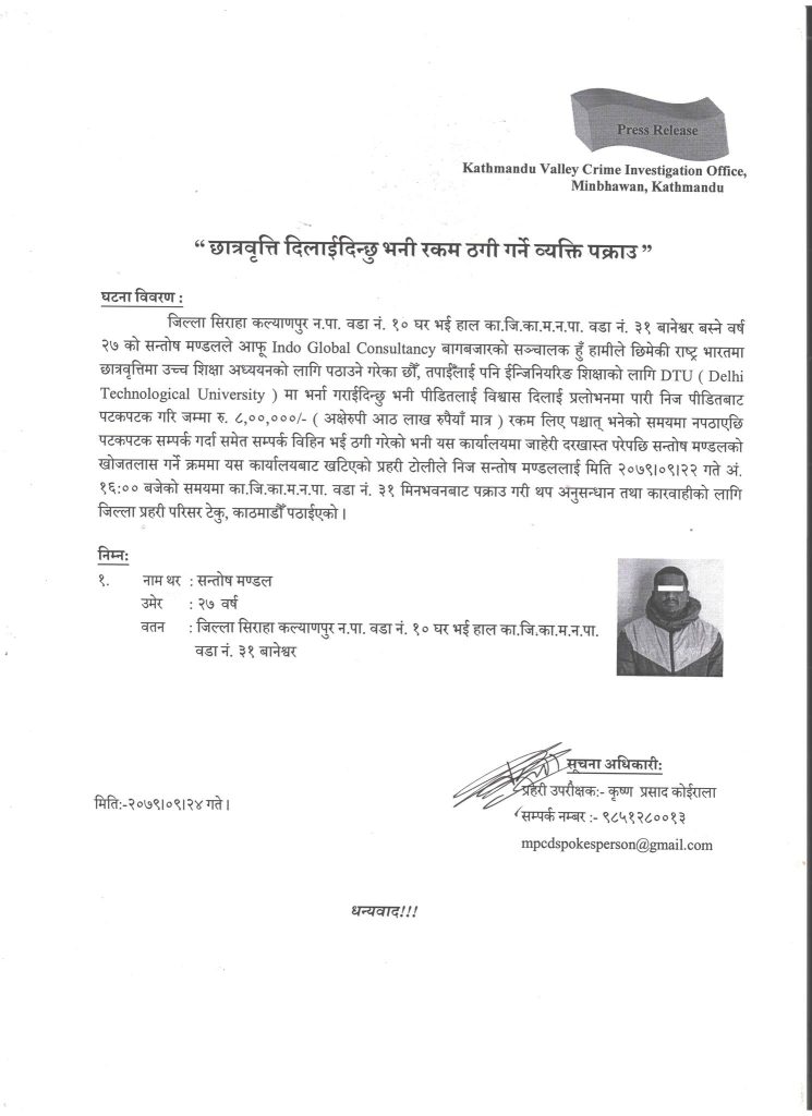 सन्तोषले बागबजारको ‘ईण्डो ग्लोबल कन्सल्टेन्सी’को सञ्चालक हुँ भनेर भारतमा ईन्जिनियरिङ शिक्षाको लागि दिल्ली टेक्नोलोजी युनिभर्सिटीमा भर्ना गराइदिन्छु भनेर ८ लाख रकम ठगी गरेको प्रहरीद्वारा जारी विज्ञप्तिमा उल्लेख छ ।