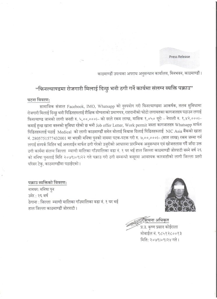 ‘सामाजिक सञ्जालको दुरुपयोग गरी फिनल्याण्डमा आकर्षक, तबल र सुविधामा रोजगारी मिलाइ दिन्छु भनी पीडितहरूलाई शैक्षिक योग्यताको प्रमाणपत्र, राहदानीको फोटो लगायतका कागजपत्रहरू पठाउन लगाई फिनल्याण्ड जानको लागि जनही रू. ५ लाखको दरले रकम लाग्छ’, मनीषाले भन्ने गरेको प्रहरीले विज्ञप्तिमा जनाएको छ ।