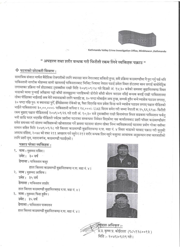 कार्यालयले पाकिस्तानी नागरिक मोहम्मद सामी खानलाई अपहरण गरेको अभियोगमा तीन जना पाकिस्तानी नागरिकलाई नै काठमाडौंको बुढानिलकण्ठबाट पक्राउ गरेको विज्ञप्तिमा उल्लेख छ ।