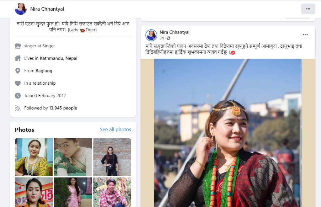 गायिका छन्त्यालले जहाज दुर्घटना हुनुभन्दा दुई घण्टा अगाडि माघी पर्वको अवसरमा फेसबुकबाट शुभकामना दिएकी छिन् ।