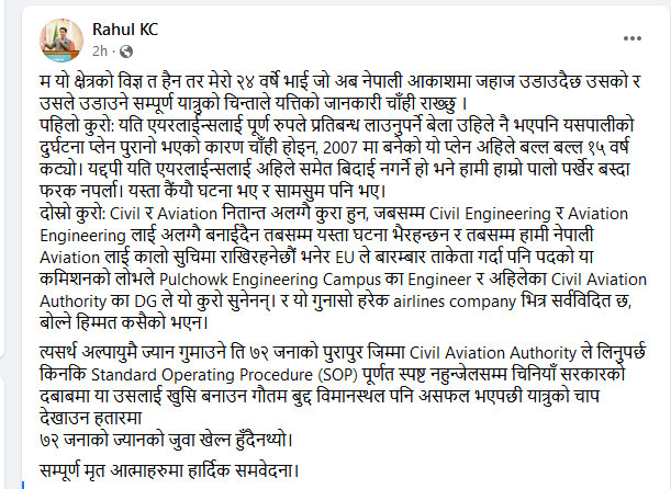 उनले भनेका छन, ‘म यो क्षेत्रको विज्ञ त हैन । तर, मेरो २४ वर्षे भाई जो अब नेपाली आकाशमा जहाज उडाउँदैछ उसको र उसले उडाउने सम्पूर्ण यात्रुको चिन्ताले यत्तिको जानकारी चाहिँ राख्छु ।’