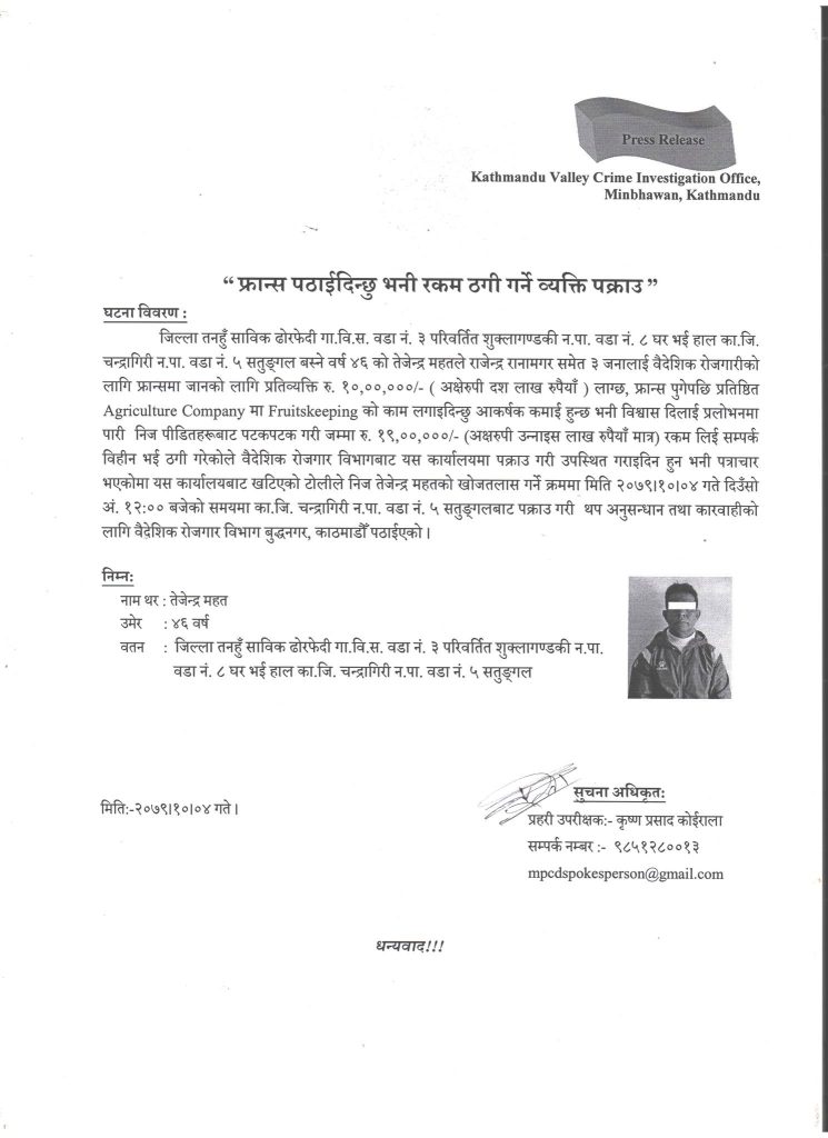 फ्रान्स पठाइदिन्छु भन्दै प्रलोभनमा पारी १९ लाख रुपियाँ ठगी गरेको अभियोगमा महतलाई पक्राउ गरिएको प्रहरीद्वारा जारी विज्ञप्तिमा उल्लेख छ ।