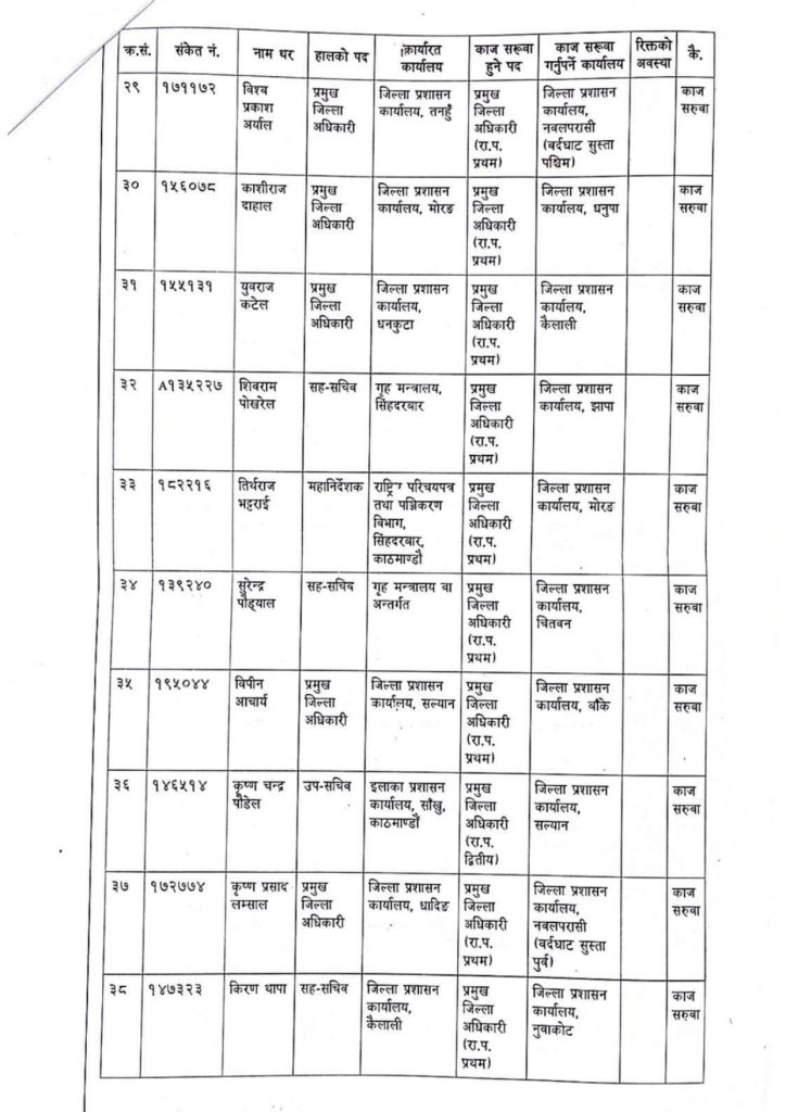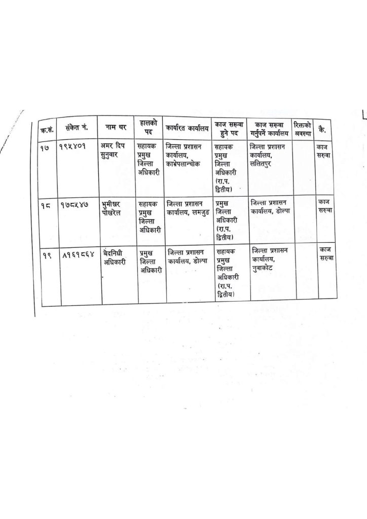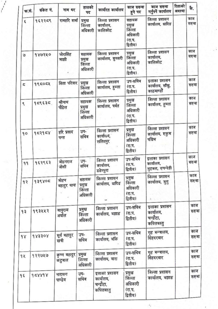 हरिप्रसाद पन्तको जिप्रका रुकुम पश्चिमको प्रजिअ, मोहनराज जोशी इलाका प्रशासन कार्यालय बुटवल, बाबुराम अर्याल इलाका प्रशासन कार्यालय चन्द्रौटा, सूर्यबहादुर खत्रीको गृह मन्त्रालय, कृष्णबहादुर कटुवालको गृह मन्त्रालय, नारायण पाण्डेयको जिल्ला प्रशासन कार्यालय बझाुङको प्रजिअमा काज सुरुवा भएको छ ।