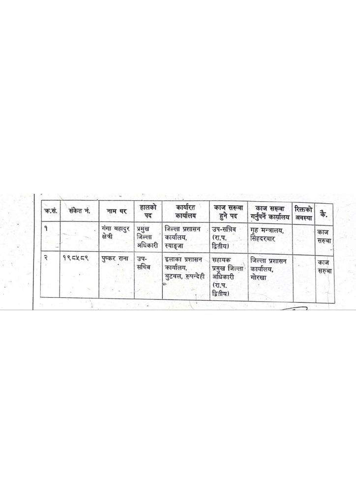 शंकरहरि आचार्यको जिप्रका कपिलवस्तु, थानेश्वर गौतमको गृह मन्त्रालय, लक्ष्मण ढकालको जिप्रका अछाम, पुण्यविक्रम पौडेलको जिप्रका काभ्रेपलान्चोक, सागरमणि पाठकको जिप्रका गुल्मी, लीलाकुमारी केसी पाण्डेको जिप्रका धनकुटा, मोहनराज जोशीको इलाका प्रशासन कार्यालय बुटवल, दिलकुमार तामाङको गृह मन्त्रालयमा काज सरुवा भएको छ ।
