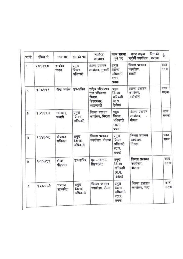 ईन्द्रदेव यादवको जिल्ला प्रशासन कार्यालय (जिप्रका) सर्लाही, मीना अर्यालको जिप्रका अर्घाखाँची, लालबाबु कवारीको जिप्रका गोरखा, भोजराज खतिवडाको जिप्रका सिरहा, शेखर पौड्यालको जिप्रका दोलखा, नवराज सापकोटाको जिप्रका बारामा काज सरुवा भएको छ ।