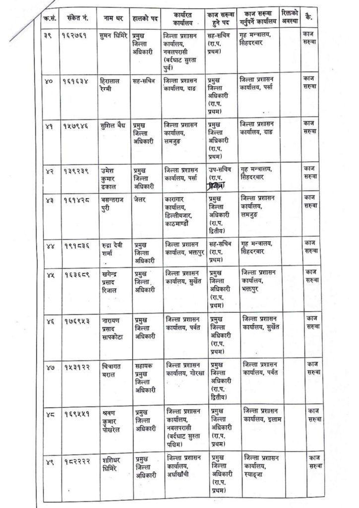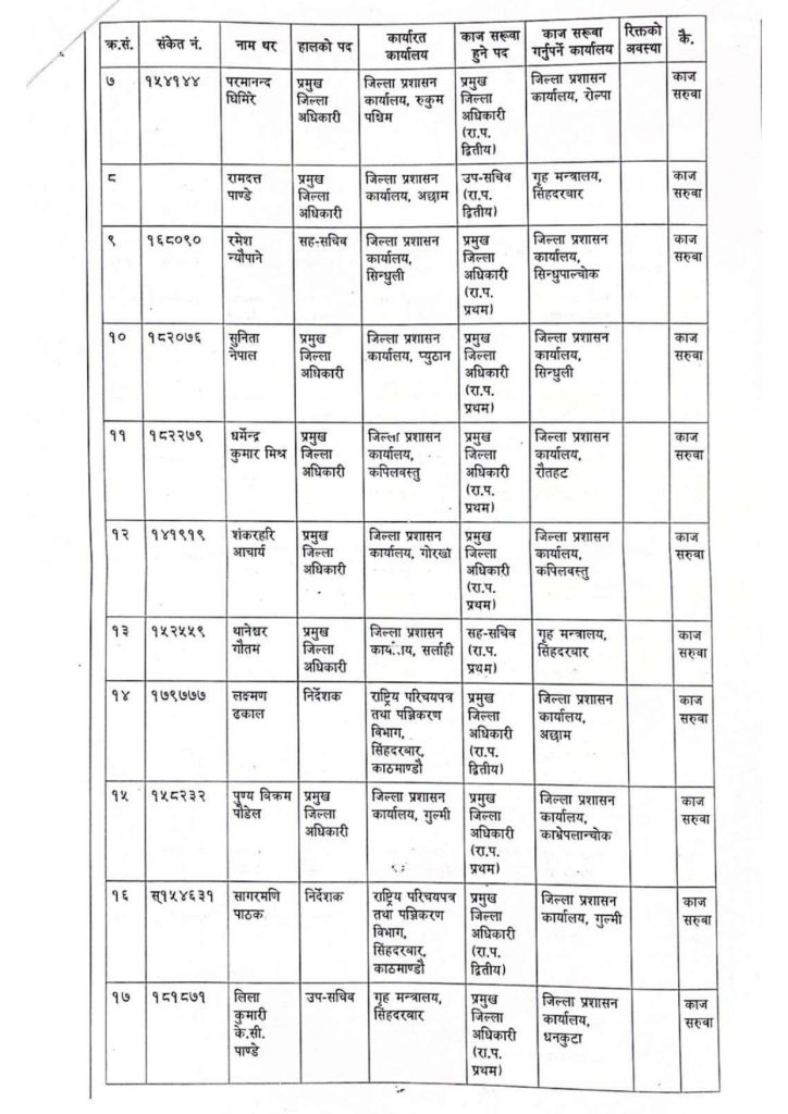 सुमन घिमिरेको गृह मन्त्रालय, हीरालाल रेग्मीको जिप्रका पर्सा, सुशील बैद्यको जिप्रका दाङ, उमेशकुमार ढकालको गृह मन्त्रालय, बसन्तराज पुरीको जिप्रका लमजुङ, रुद्रादेवी शर्माको गृह मन्त्रालय, खगेन्द्रप्रसाद रिजालको जिप्रका भक्तपुर, नारायणप्रसाद सापकोटाको जिप्रका सुर्खेत, चित्रागत बरालको जिप्रका पर्वत, श्रवणकुमार पोखरेलको जिप्रका इलाम र शशिधर घिमिरेको जिप्रका स्याङजामा काज सरुवा भएको सूचनामा उल्लेख छ ।