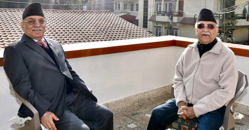 काठमाडौं । माओवादी केन्द्रका अध्यक्ष समेत रहेका प्रधानमन्त्री पुष्पकमल दाहाल ‘प्रचण्ड’ र एमालेका अध्यक्ष खड्गप्रसाद ओलीबीच भेटवार्ता भएको छ ।