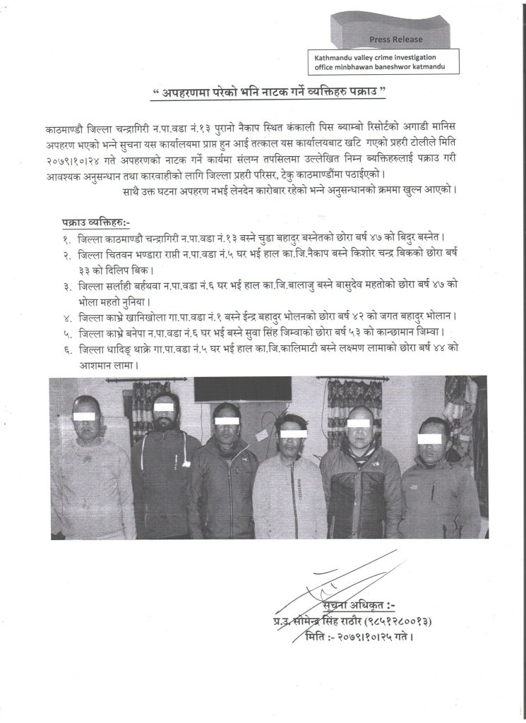 घटनाको अनुसन्धान गर्ने क्रममा अपहरणको घटना नभइ लेनदेन कारोबार रहेको भन्ने खुलेको विज्ञप्तिमा उल्लेख छ ।