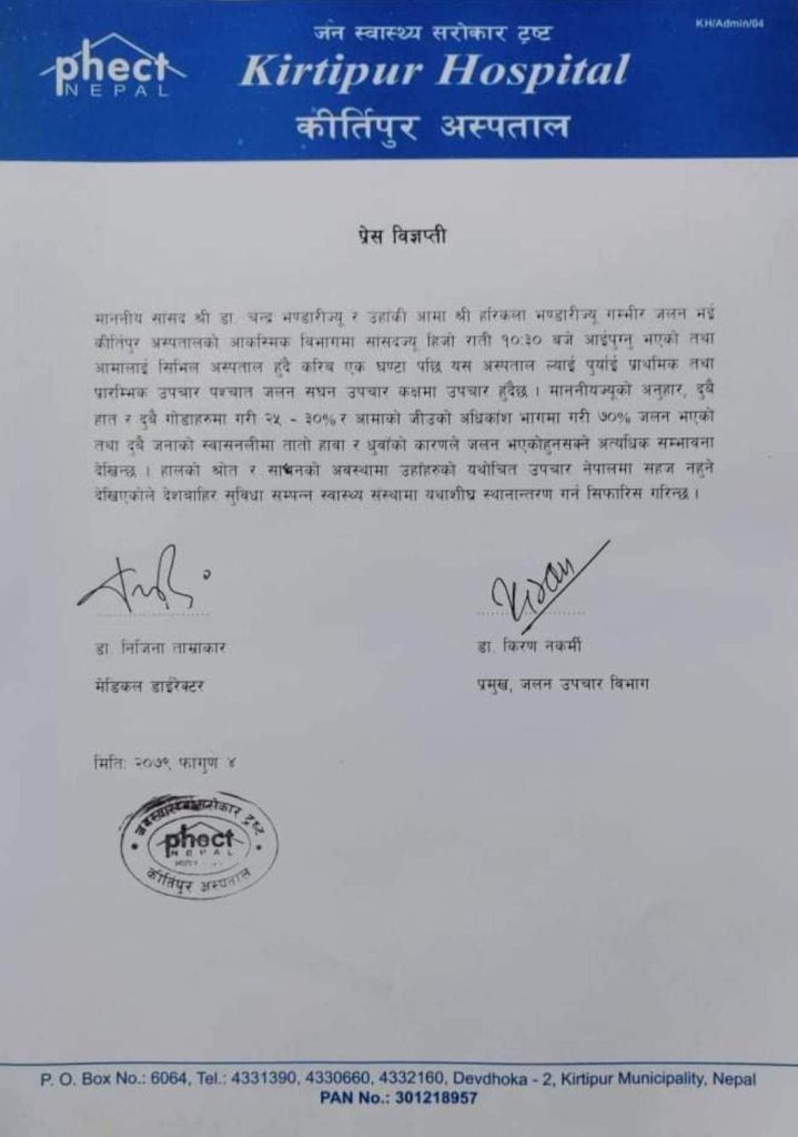 अस्पतालको जलन उपचार विभागका प्रमुख डा.किरण नकर्मी र मेडिकल डाइरेक्टर डा.निजिना ताम्राकारले बिहीबार बिहान संयुक्त विज्ञप्ति जारी गरेर आमा–छोराको जलन सघन उपचार कक्षमा उपचार भइरहेको जनाएका छन् ।