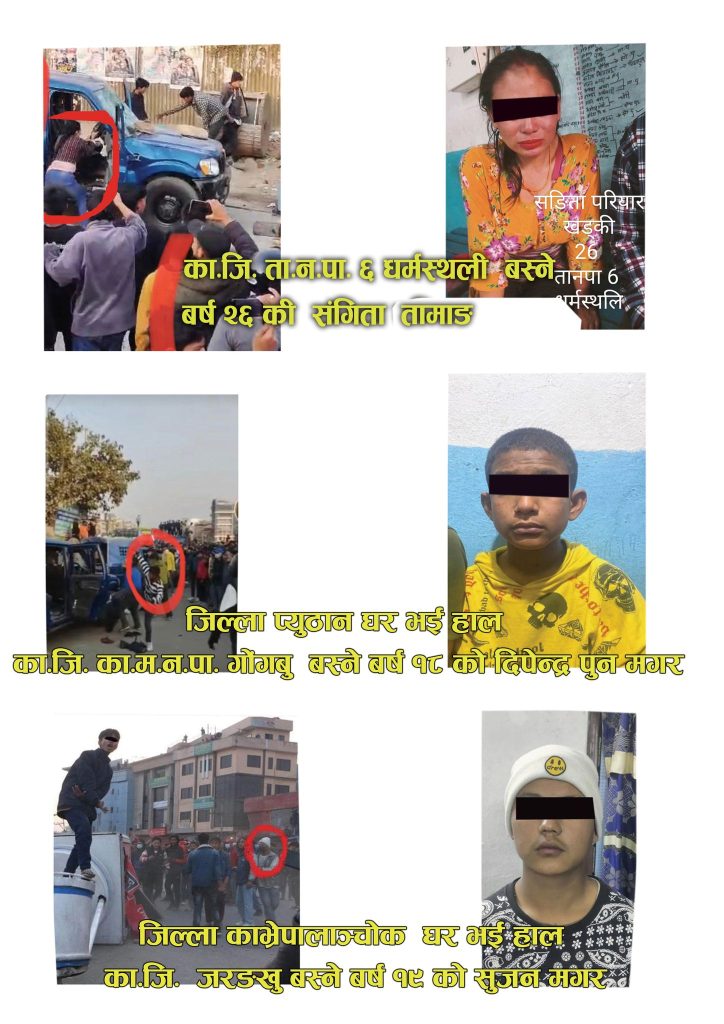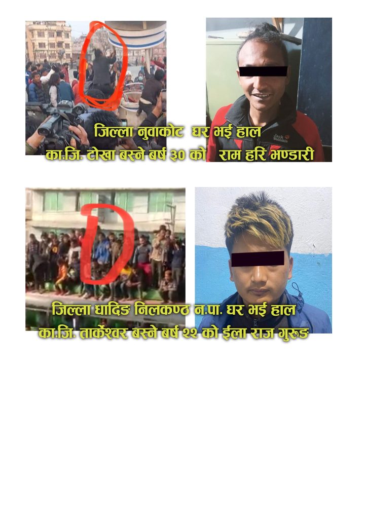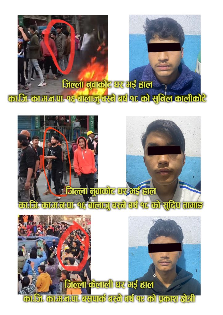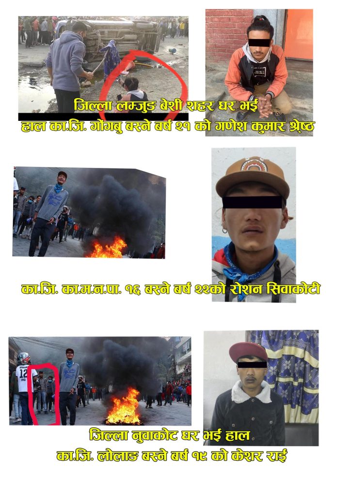 नुवाकोटको ककनी ८ घर भई हाल बालाजु बस्ने वर्ष १८ का सुनिल कालिकोटे, नुवाकोटको ककनी ७ घर भई हाल बालाजु बस्ने वर्ष १८ का सुदीप तामाङ, धादिङको नीलकण्ठ ६ घर भई हाल तार्केश्वर बस्ने वर्ष १८ का विकाश गुरुङ, चितवनको रत्ननगर ११ घर भई हाल डल्लु बस्ने वर्ष २७ का सविधान परियार, नुवाकोटको सूर्यगढी ४ घर भई हाल काठमाडौंको लोलाङ बस्ने वर्ष १९ का केशर राई, तार्केश्वेर बस्ने वर्ष १९ का कविन खड्गीलाई पनि प्रहरीले पक्राउ गरेको छ ।