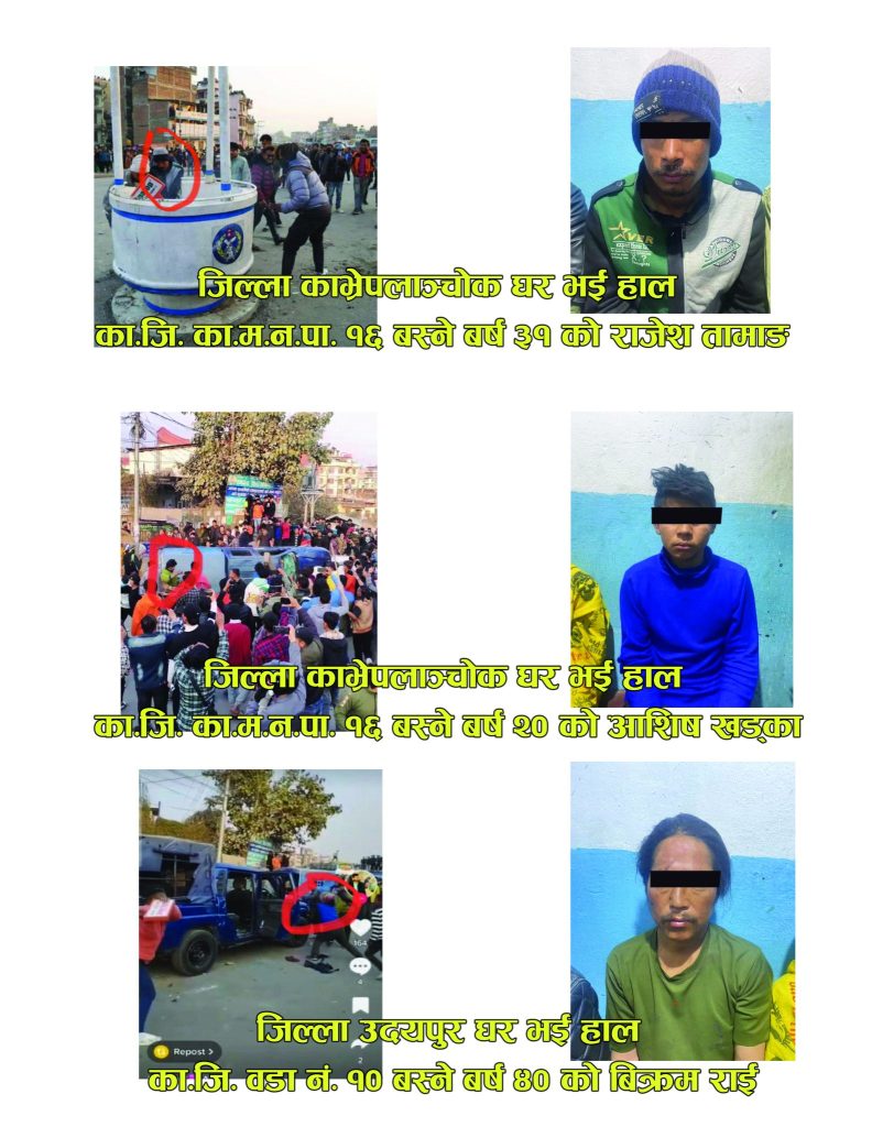 काठमाडौंमा प्रहरीको गाडी जलाउनेहरूलाई प्रहरीले घरबाट घिसारेर ल्यायो, थप २३ जना पक्राउ (तस्वीर)